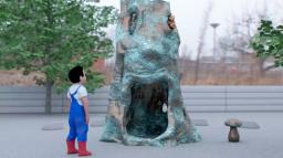 Den två meter höga skulpturen på förskolegården består av en stubbe med ett antal figurer...