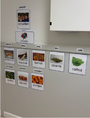 Varje månad får barnen utforska ”månadens grönsak” på olika sätt. De pratar om grönsaken, hur den växer och om namnets ursprung – såsom att brysselkål kommer från Bryssel.